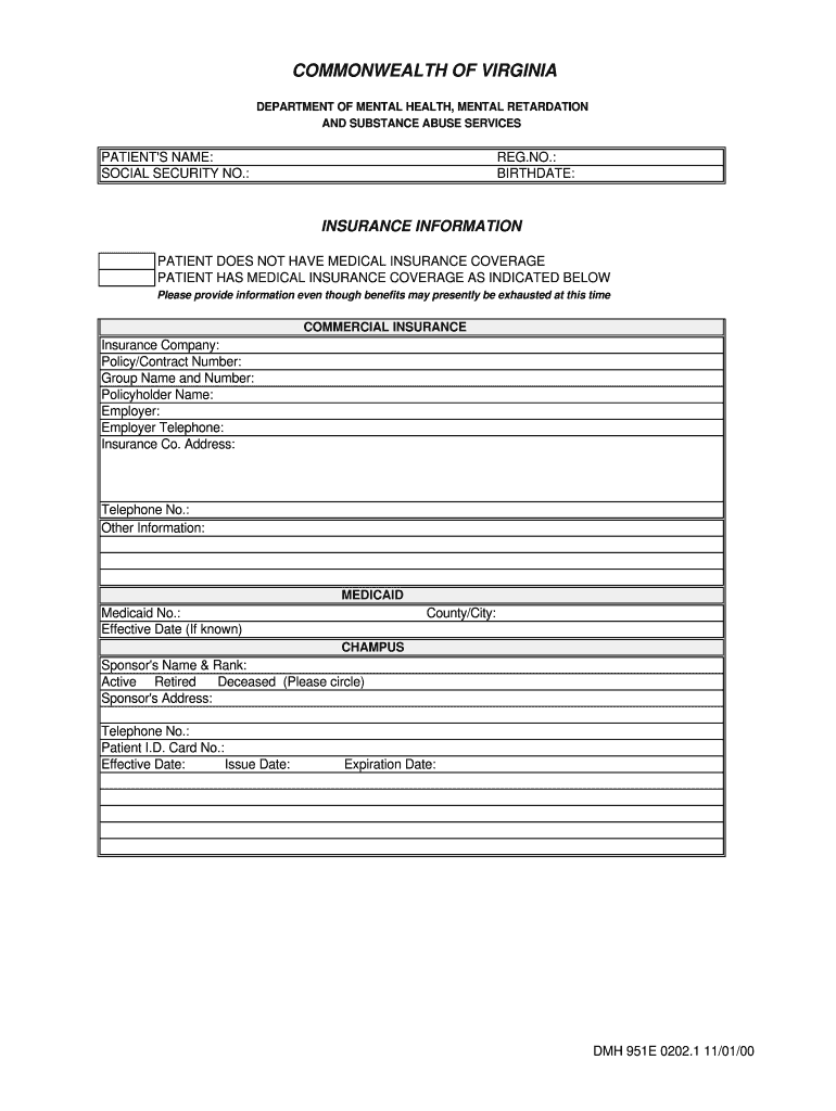 COMMONWEALTH OF VIRGINIA DEPARTMENT OF MENTAL HEALTH, MENTAL RETARDATION AND SUBSTANCE ABUSE SERVICES PATIENT IS NAME: SOCIAL SECURITY NO.: REG.NO.: BIRTHDATE: INSURANCE INFORMATION PATIENT DOES NOT