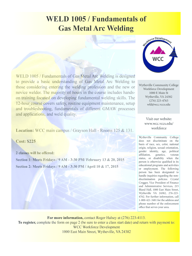 Get the free WELD 1005 Fundamentals of Gas Metal Arc Welding - wcc vccs