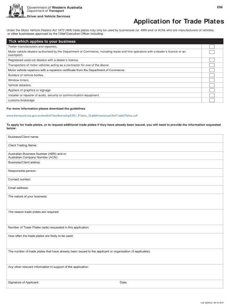 Get the free Application for Trade Plates E96 Application for Trade Plates E96 - transport wa gov