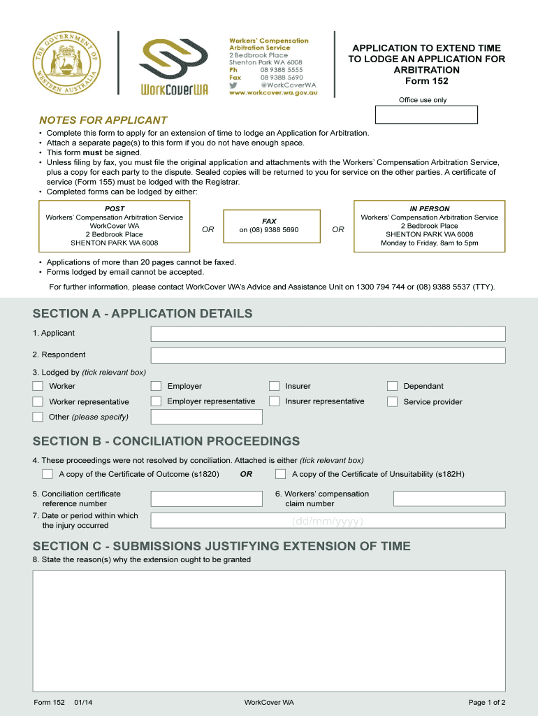 APPLICATION TO EXTEND TIME TO LODGE AN APPLICATION FOR ARBITRATION Form 152 Office use only NOTES FOR APPLICANT Complete this form to apply for an extension of time to lodge an Application for Arbitration.