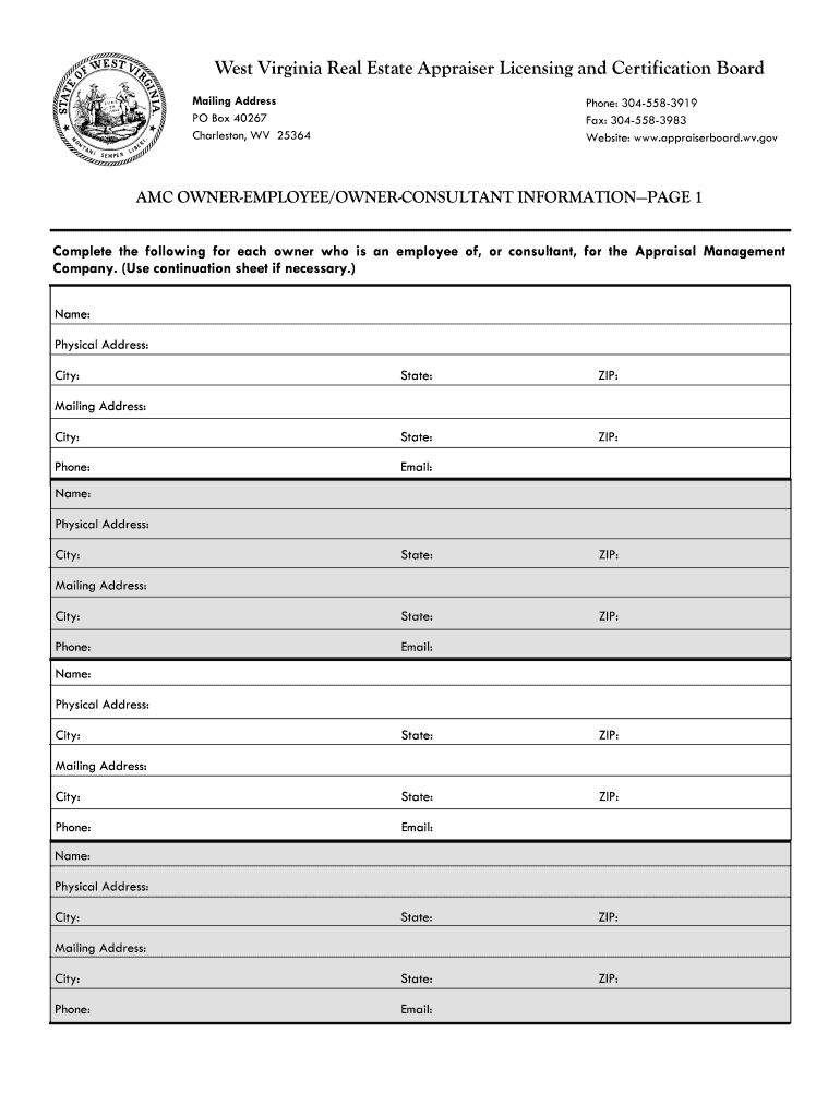 West Virginia Real Estate Appraiser Licensing and Certification Board Mailing Address PO Box 40267 Charleston, WV 25364 Phone: 3045583919 Fax: 3045583983 Website: www.appraiserboard.wv.gov AMC OWNEREMPLOYEE/OWNERCONSULTANT