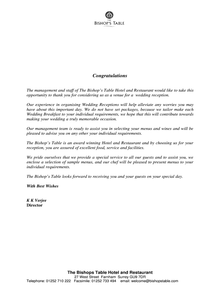 The management and staff of The Bishops Table Hotel and Restaurant would like to take this