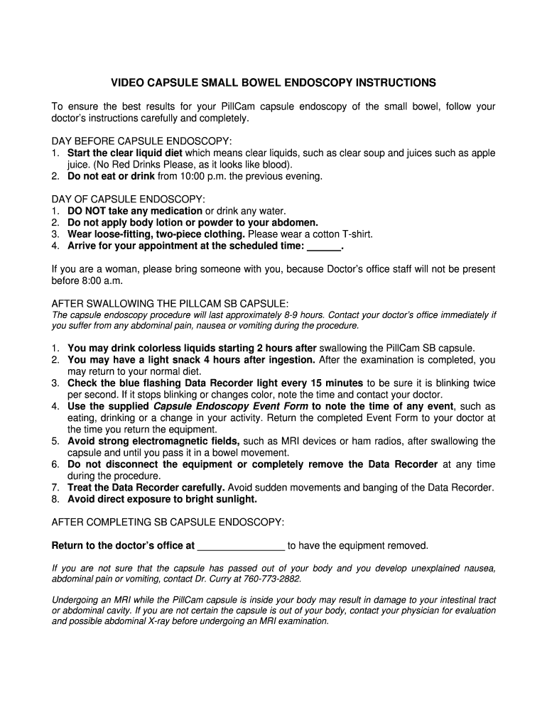 VIDEO CAPSULE SMALL BOWEL ENDOSCOPY INSTRUCTIONS