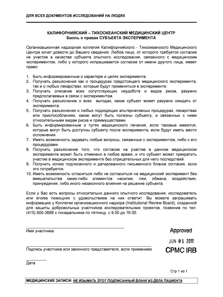 Get the free Experimental Subjects Bill of Rights - cpmc