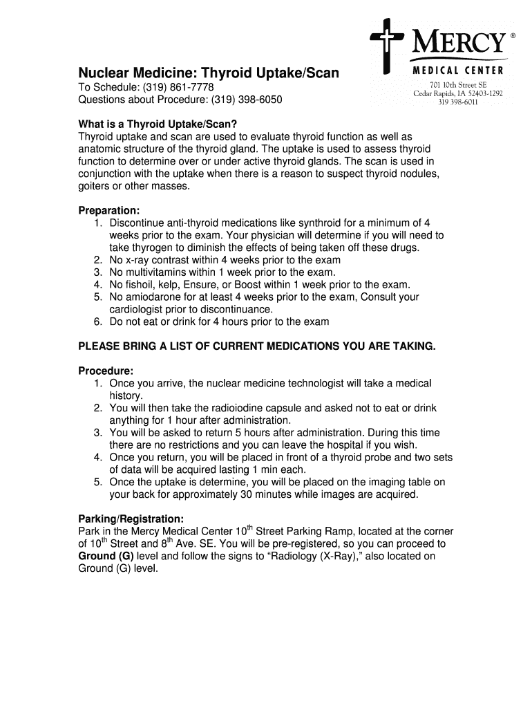 Nuclear Medicine: Thyroid Uptake/Scan To Schedule: (319) 861-7778 Questions about Procedure: (319) 398-6050 What is a Thyroid Uptake/Scan? Thyroid uptake and scan are used to evaluate thyroid function