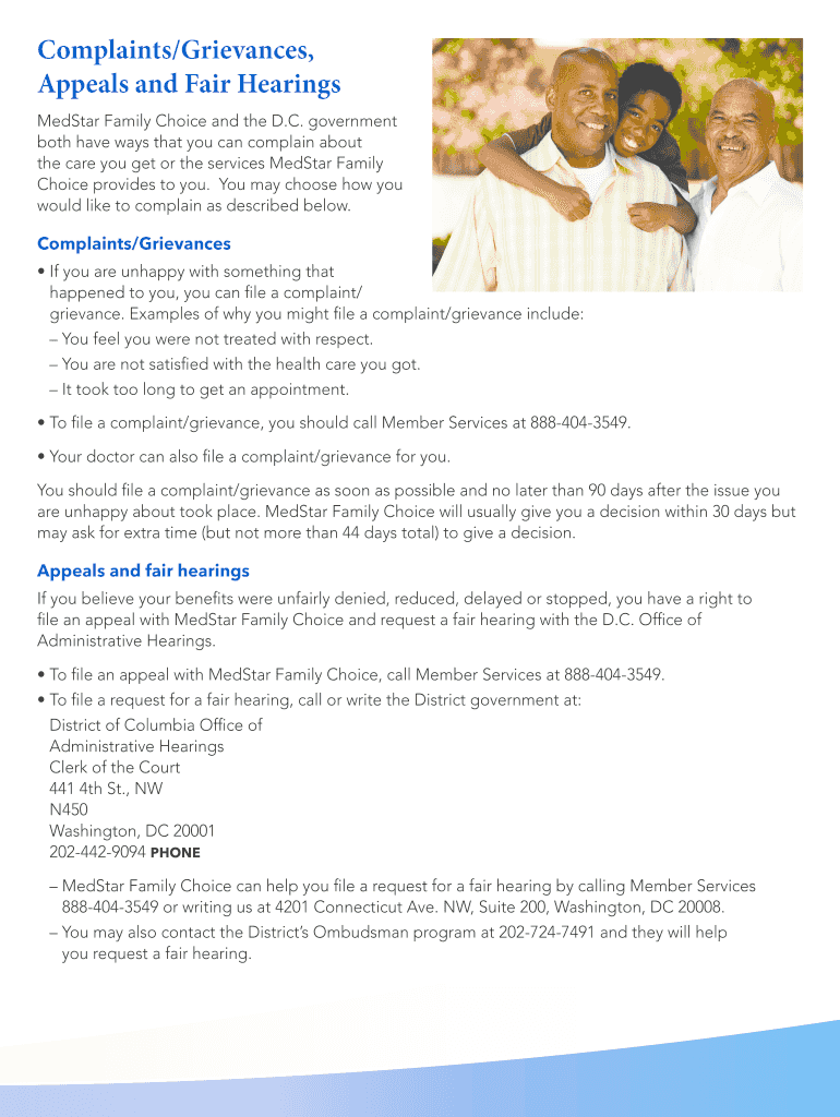 Complaints/Grievances, Appeals and Fair Hearings Megastar Family Choice and the D.C. government both have ways that you can complain about the care you get or the services Megastar Family Choice provides