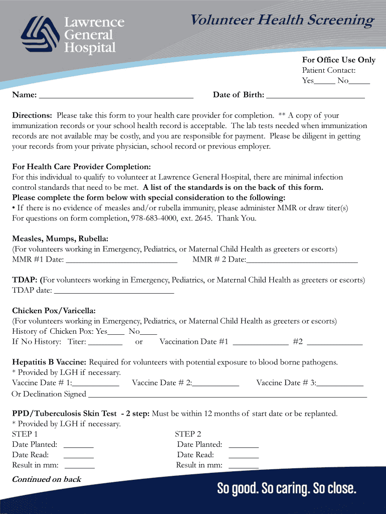 Get the free Volunteer Health Screening - Lawrence General Hospital - lawrencegeneral