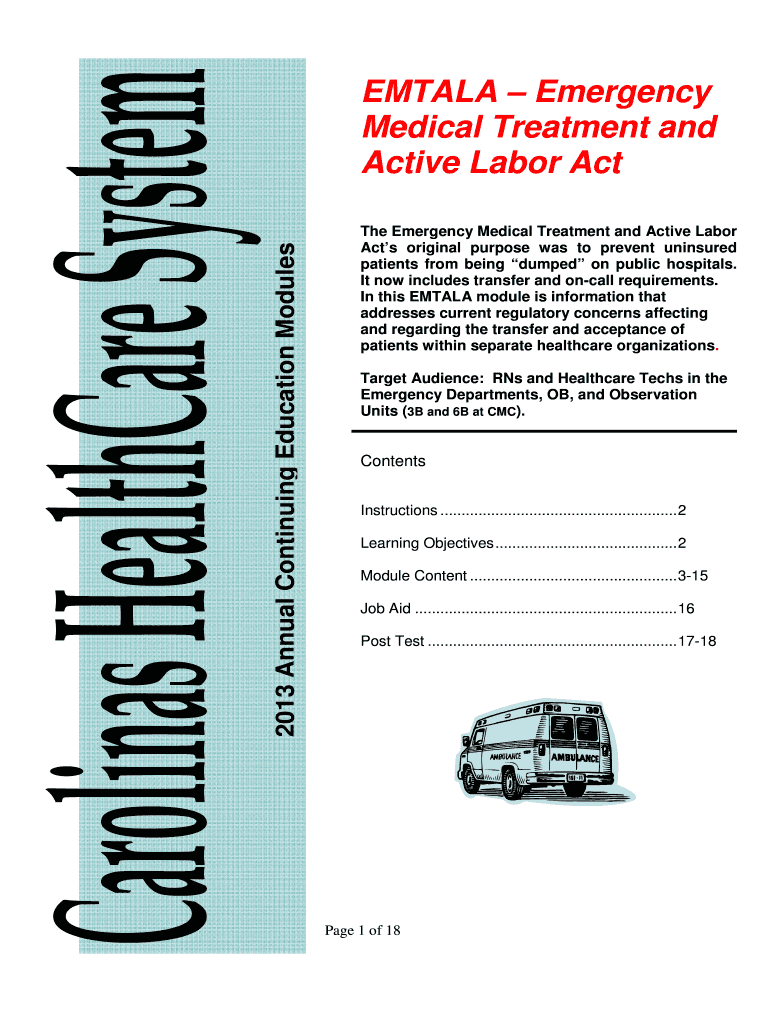 2013 Annual Continuing Education Modules IMPALA Emergency Medical Treatment and Active Labor Act The Emergency Medical Treatment and Active Labor Acts original purpose was to prevent uninsured patients