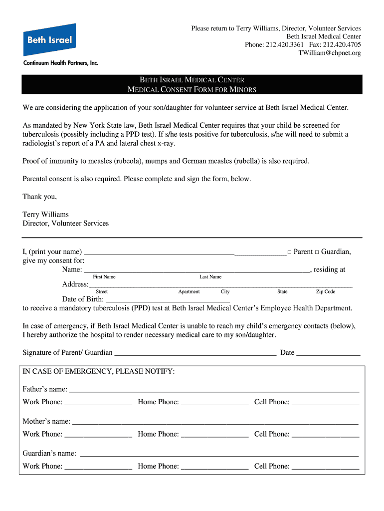 Please return to Terry Williams, Director, Volunteer Services Beth Israel Medical Center Phone: 212.420.3361 Fax: 212.420.4705 William chant.org BETH ISRAEL MEDICAL CENTER MEDICAL CONSENT FORM FOR