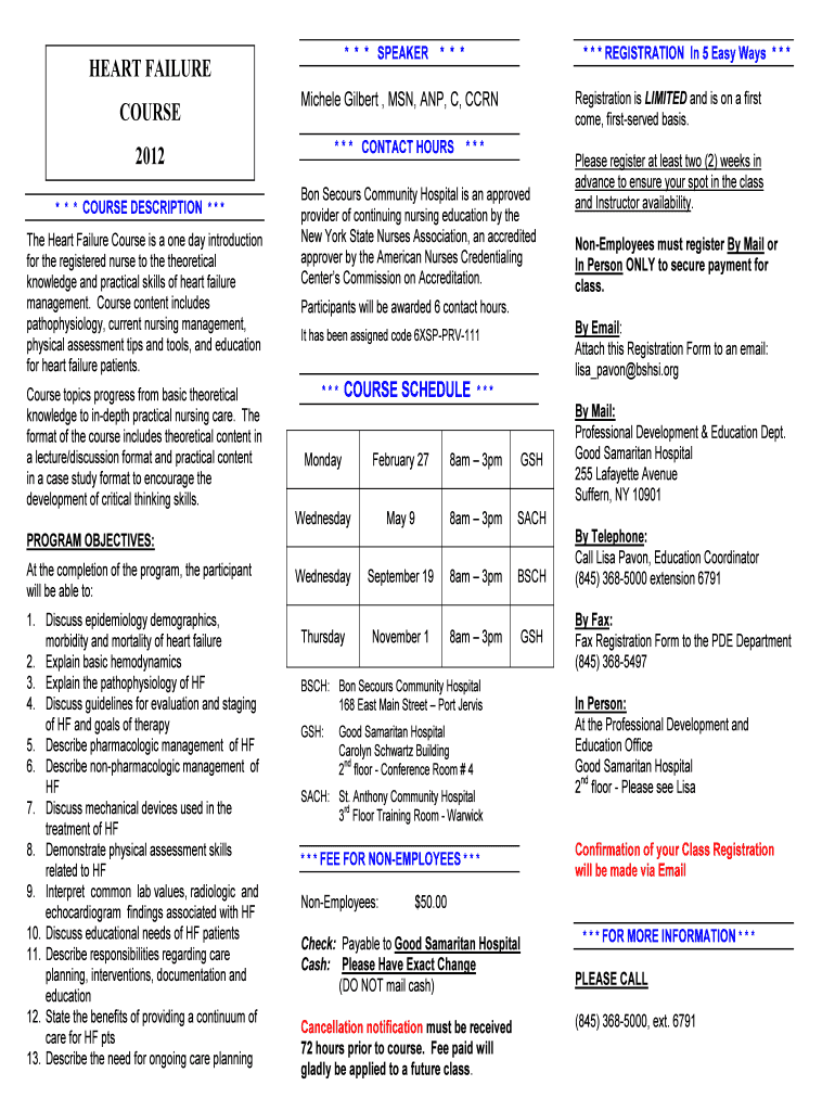 * * * SPEAKER HEART FAILURE COURSE The Heart Failure Course is a one-day introduction for the registered nurse to the theoretical knowledge and practical skills of heart failure management. Course