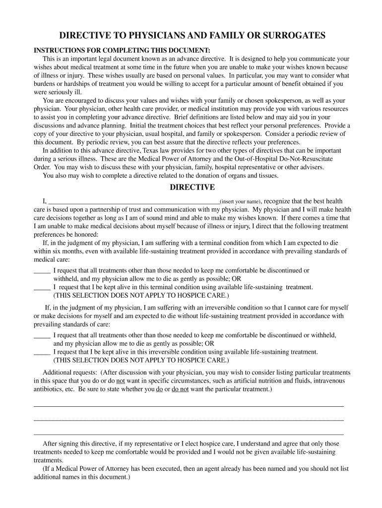 DIRECTIVE TO PHYSICIANS AND FAMILY OR SURROGATES