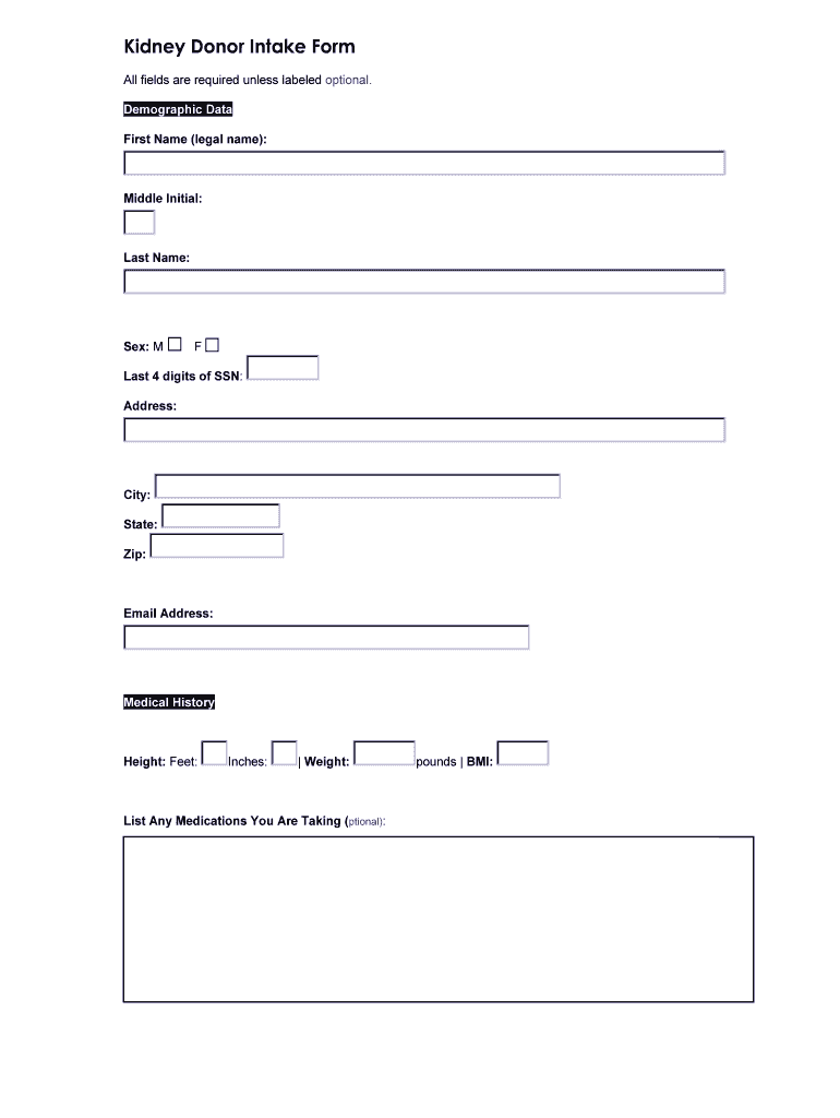 Kidney Donor Intake Form All fields are required unless labeled optional. Demographic Data First Name (legal name): Middle Initial: Last Name: