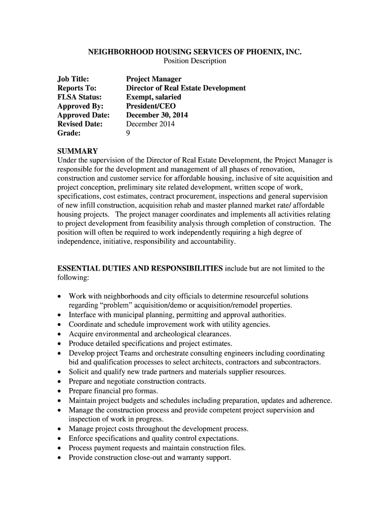 NEIGHBORHOOD HOUSING SERVICES OF PHOENIX, INC. Position Description Job Title: Reports To: FLEA Status: Approved By: Approved Date: Revised Date: Grade: Project Manager Director of Real Estate Development