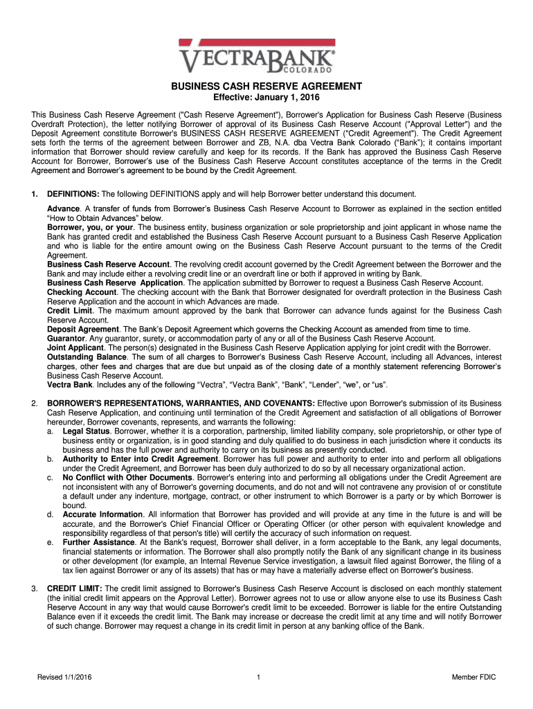 BUSINESS CASH RESERVE AGREEMENT Effective: January 1, 2016, This Business Cash Reserve Agreement (Cash Reserve Agreement “), Borrower's Application for Business Cash Reserve (Business Overdraft