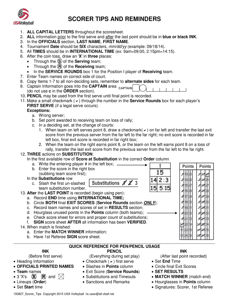 SCORER TIPS AND REMINDERS 1. 2. 3. 4. 5. 6.ALL CAPITAL LETTERS throughout the scoresheet. ALL information prior to the first serve and after the last point should be in blue or black INK. In the OFFICIALS