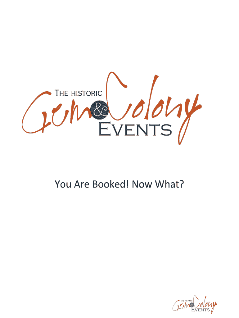 You Are Booked! Now What? Table of Contents Welcome to Gem Colony Events.3 Estimated 50% Payment5 Floor Plan.6 Preparing for your Final Meeting.8 Vendor Information.