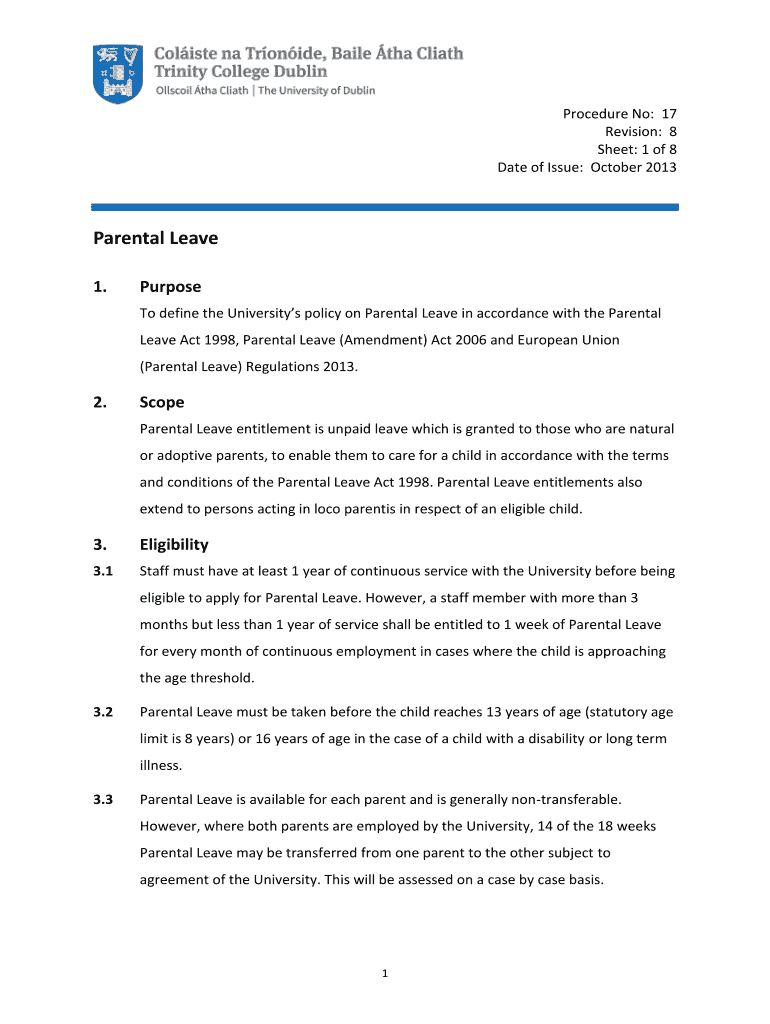 Procedure No: 17 Revision: 8 Sheet: 1 of 8 Date of Issue: October 2013 Parental Leave 1. Purpose To define the Universities' policy on Parental Leave in accordance with the Parental Leave Act 1998,