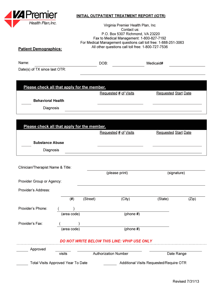 INITIAL OUTPATIENT TREATMENT REPORT (IOTA) Virginia Premier Health Plan, Inc Contact us: P.O. Box 5307 Richmond, VA 23220 Fax to Medical Management: 18008277192 For Medical Management questions call