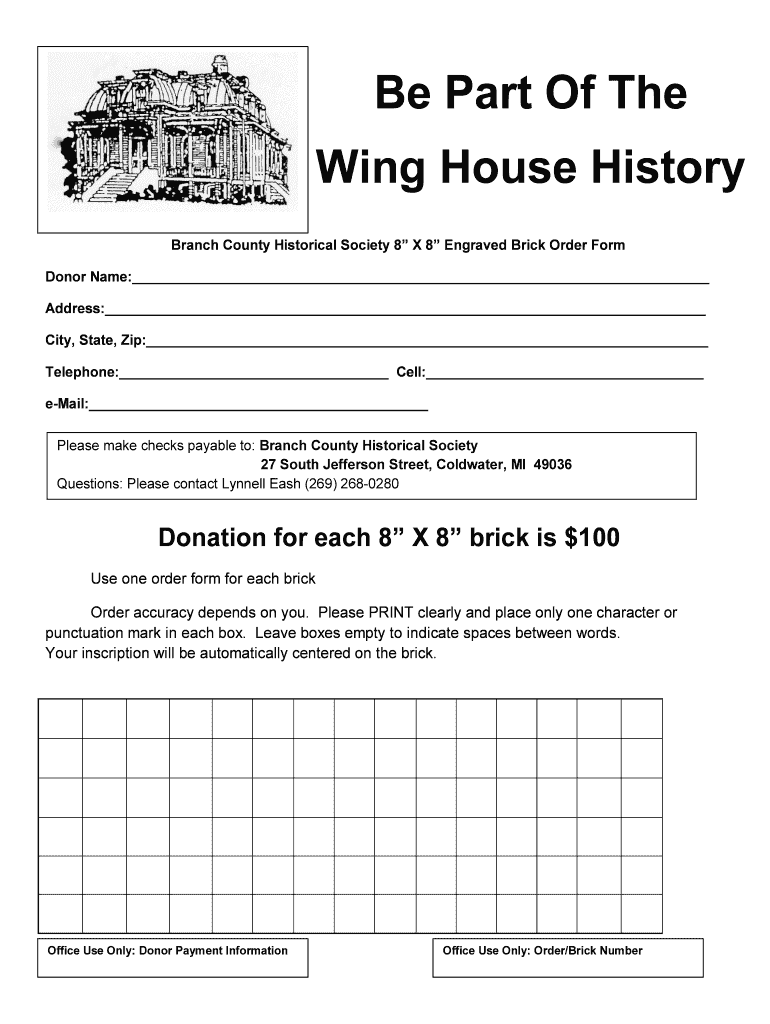 Be Part Of The Wing House History Branch County Historical Society 8 8 Engraved Brick Order Form Donor Names: Address: City, State, Zip: Telephone: Cell: email: Please make checks payable to: Branch