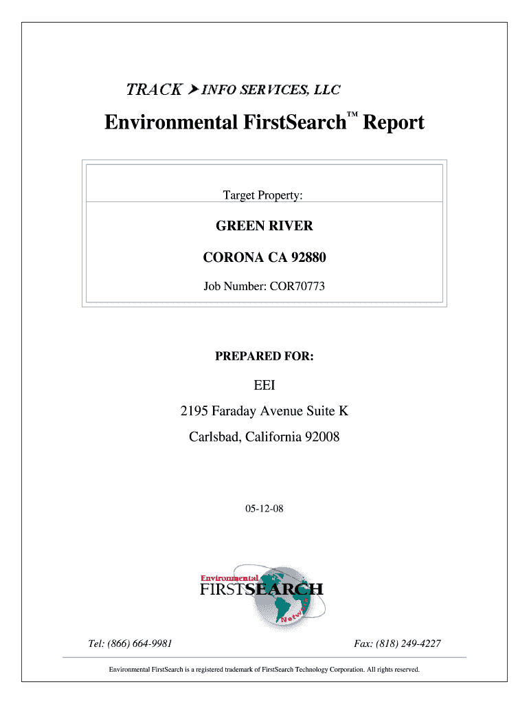 TM Environmental FirstSearch Report Target Property: GREEN RIVER CORONA CA 92880 Job Number: COR70773 PREPARED FOR: WEI 2195 Faraday Avenue Suite K Carlsbad, California 92008 051208 Tel: (866) 6649981