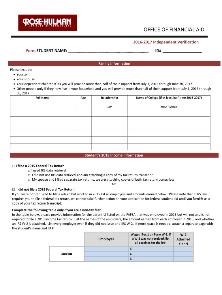 OFFICE OF FINANCIAL AID 20162017 Independent Verification Form STUDENT NAME: ID#: Family Information Please Include: Yourself Your spouse Your dependent children if a) you will provide more than half