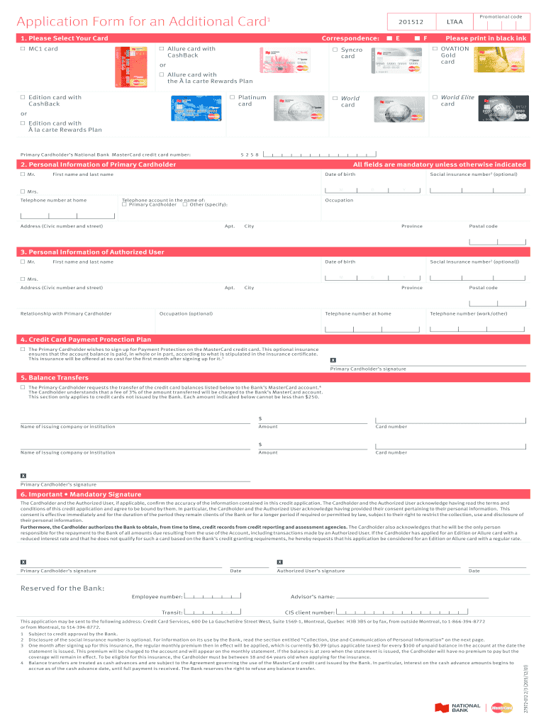 INFORMATION BOX AND APPLICATION FOR A NATIONAL BANK MASTERCARD CREDIT CARD Rates in effect at the date the card is issued except if a promotional rate applies: Annual interest rates Cards Purchases