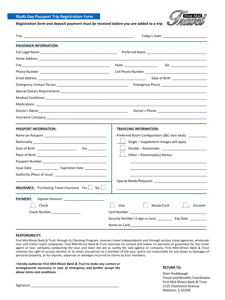 Multi- Day Passport Trip Registration Form and deposit payment must be received before you are added to a trip. Trip: Today s Date: PASSENGER INFORMATION: Full Legal Name Preferred Name Home Address