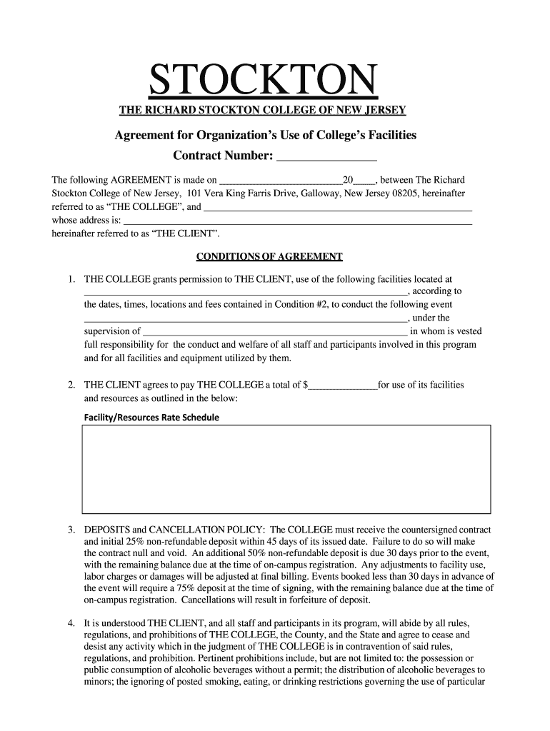 This document is an agreement between The Richard Stockton College of New Jersey and a client for the use of college facilities, outlining the conditions, responsibilities, payment, and liabilities