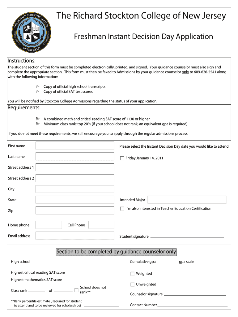 This document is an application form for prospective freshmen at The Richard Stockton College of New Jersey, designed for students seeking an instant admission decision. It requires personal information,