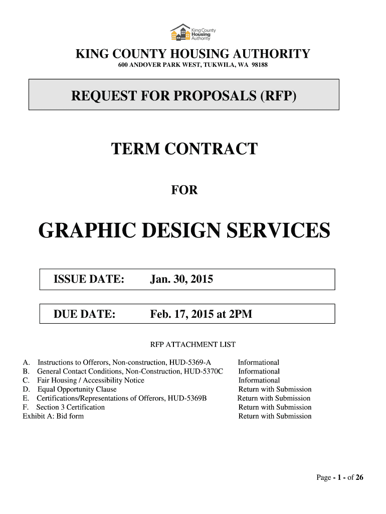 KING COUNTY HOUSING AUTHORITY 600 ANDOVER PARK WEST, TWILA, WA 98188 REQUEST FOR PROPOSALS (RFP) TERM CONTRACT FOR GRAPHIC DESIGN SERVICES ISSUE DATE: Jan. 30, 2015 DUE DATE: Feb. 17, 2015 at 2PM