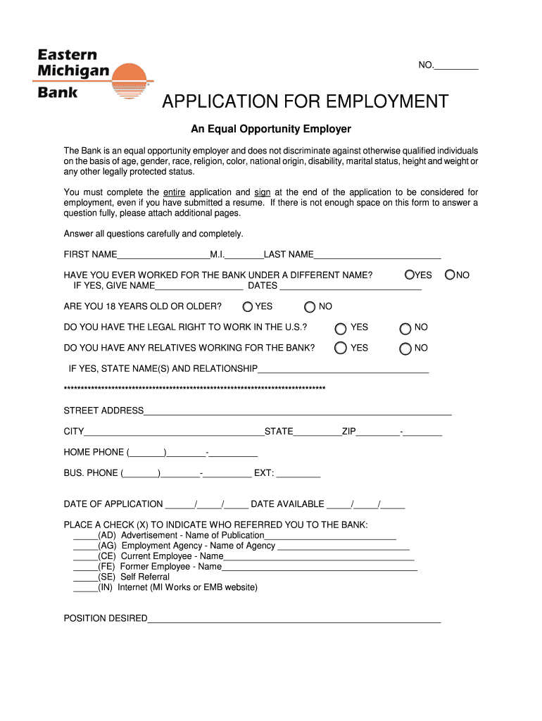 Get the free APPLICATION FOR EMPLOYMENT - Eastern Michigan Bank