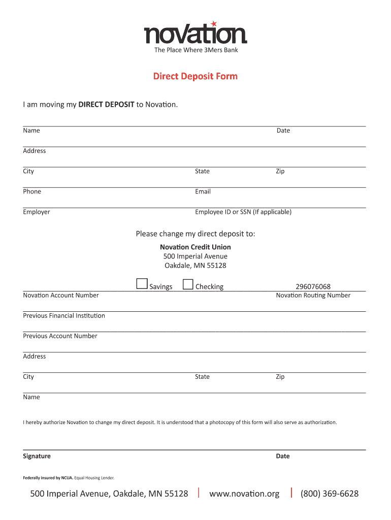 The Place Where 3Mers Bank Direct Deposit Form I am moving my DIRECT DEPOSIT to Novation. Name Date Address City State Zip Phone Email Employer Employee ID or SSN (If applicable) Please change my