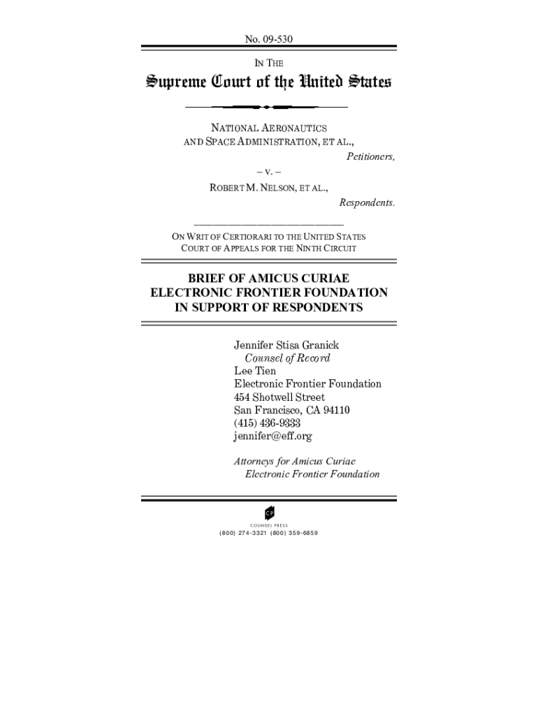 No. 09530 IN Supreme Court of the United States NATIONAL AERONAUTICS AND SPACE ADMINISTRATION, ET AL., Petitioners, v. ROBERT M. NELSON, ET AL., Respondents. ___ ON WRIT OF CERTIORARI TO THE UNITED