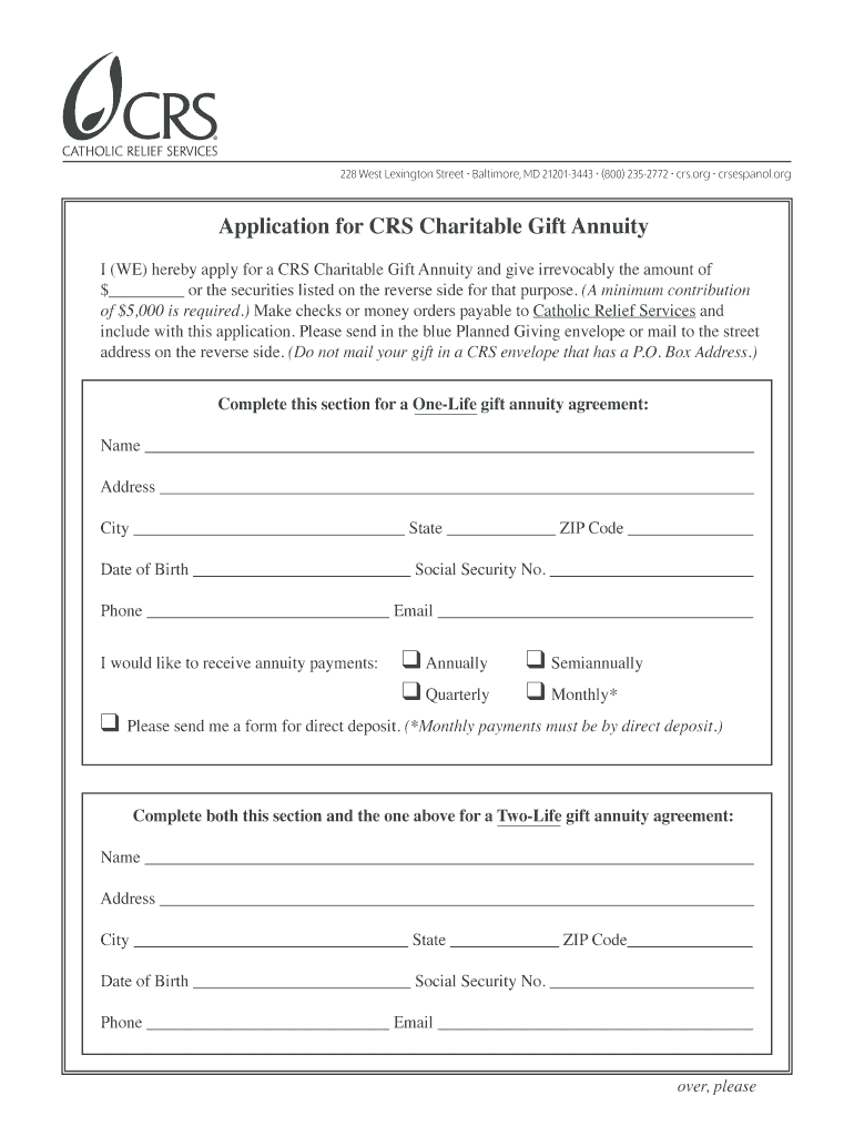 228 West Lexington Street Baltimore, MD 212013443 (800) 2352772 CRS.org Español.org Application for CRS Charitable Gift Annuity I (WE) hereby apply for a CRS Charitable Gift Annuity and give irrevocably