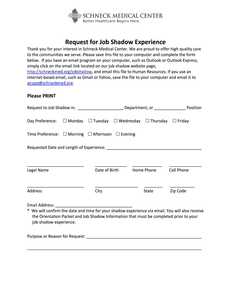Those interested in exploring potential career paths, gaining industry knowledge, or establishing networking connections may find a job shadow request form useful.