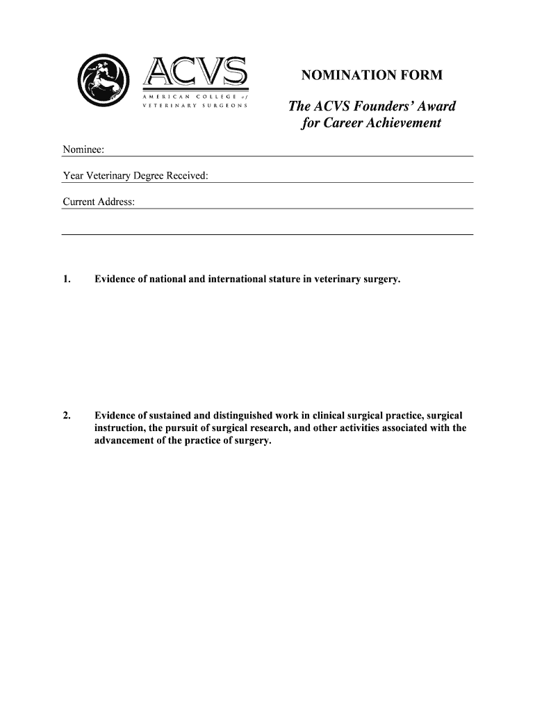 The nomination form for the ACVS Founders Award typically asks for information about the nominee's professional achievements, contributions to veterinary surgery, leadership qualities, and letters of recommendation.