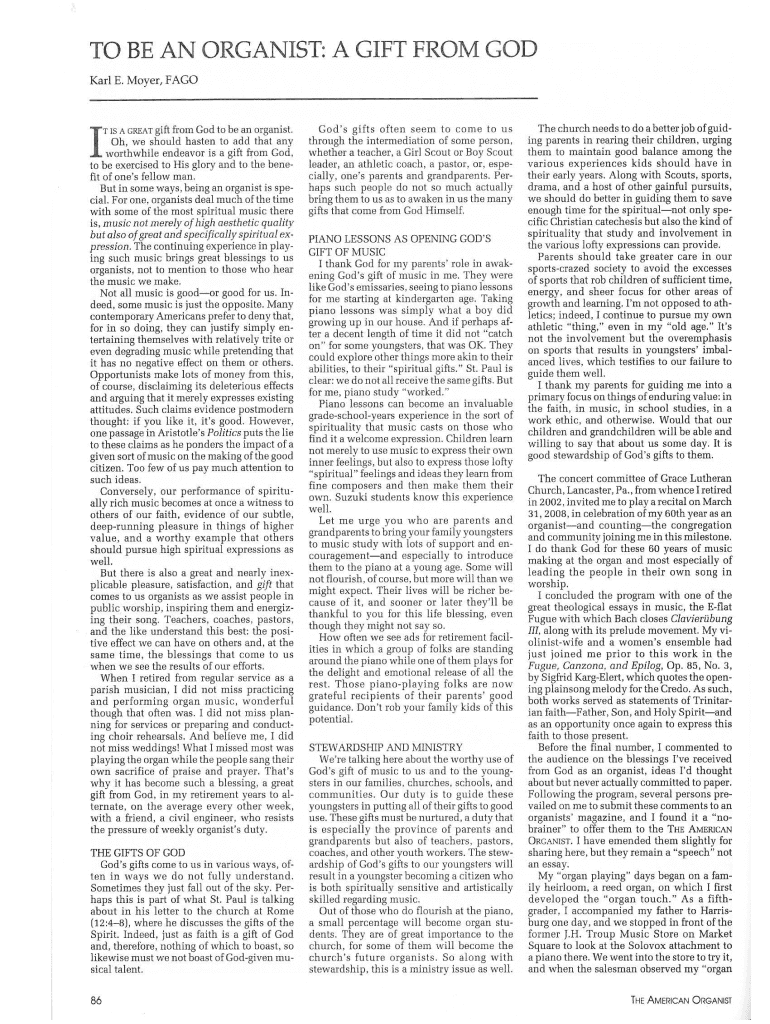 You may use pdfFiller's Gmail add-on to change, fill out, and eSign your to be an organist as well as other documents directly in your inbox by using the pdfFiller add-on for Gmail. pdfFiller for Gmail may be found on the Google Workspace Marketplace. Use the time you would have spent dealing with your papers and eSignatures for more vital tasks instead.