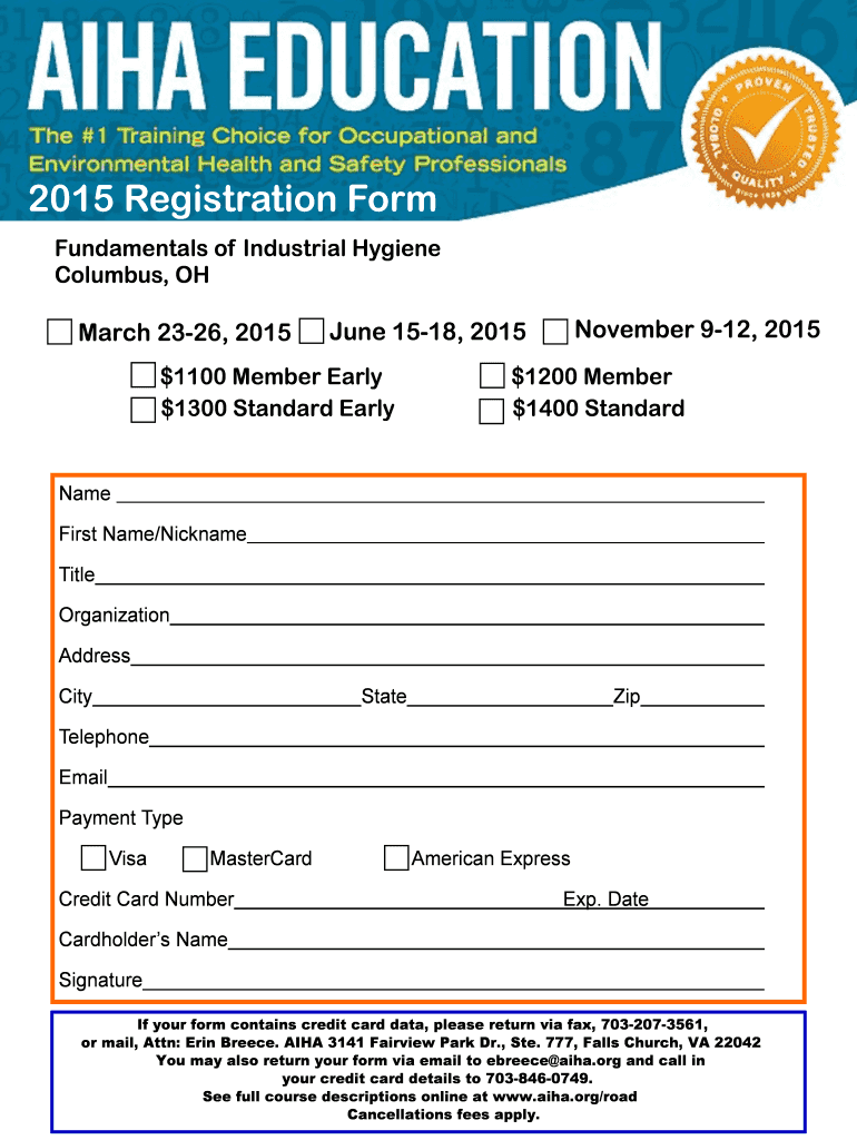 Get the free 2015 Registration Form Fundamentals of Industrial Hygiene Columbus, OH March 2326, 2...