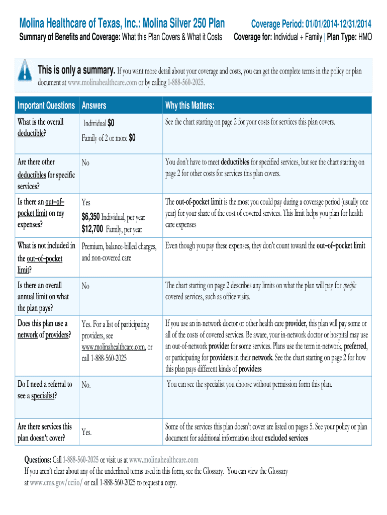 Molina Healthcare of Texas, Inc.: Molina Silver 250 Plan Summary of Benefits and Coverage: What this Plan Covers & What it CostsCoverage Period: 01/01/201412/31/2014 Coverage for: Individual + Family