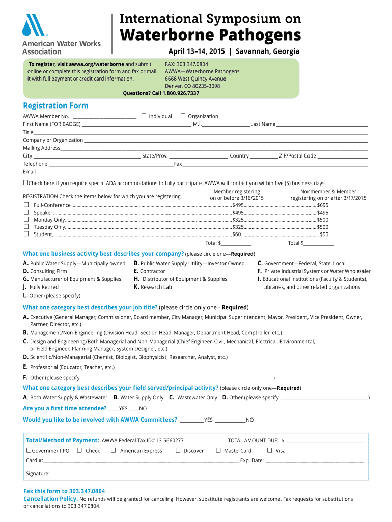 International Symposium on Waterborne Pathogens April 1314, 2015 Savannah, Georgia To register, visit awwa.org/waterborne and submit online or complete this registration form and fax or mail it with