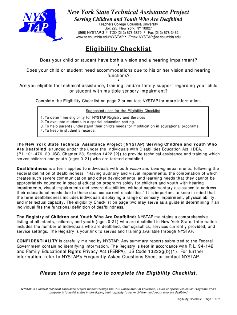 This document is a checklist to determine eligibility for technical assistance and services for children and youth who are deafblind in New York State. It outlines criteria regarding vision and hearing