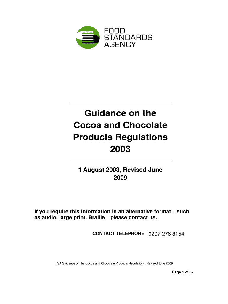 Guidance on cocoa and ChocolateProducts Regulations20031 August 2003, Revised June 2009If you require this information in an alternative format such as audio, large print, Braille please contact us.