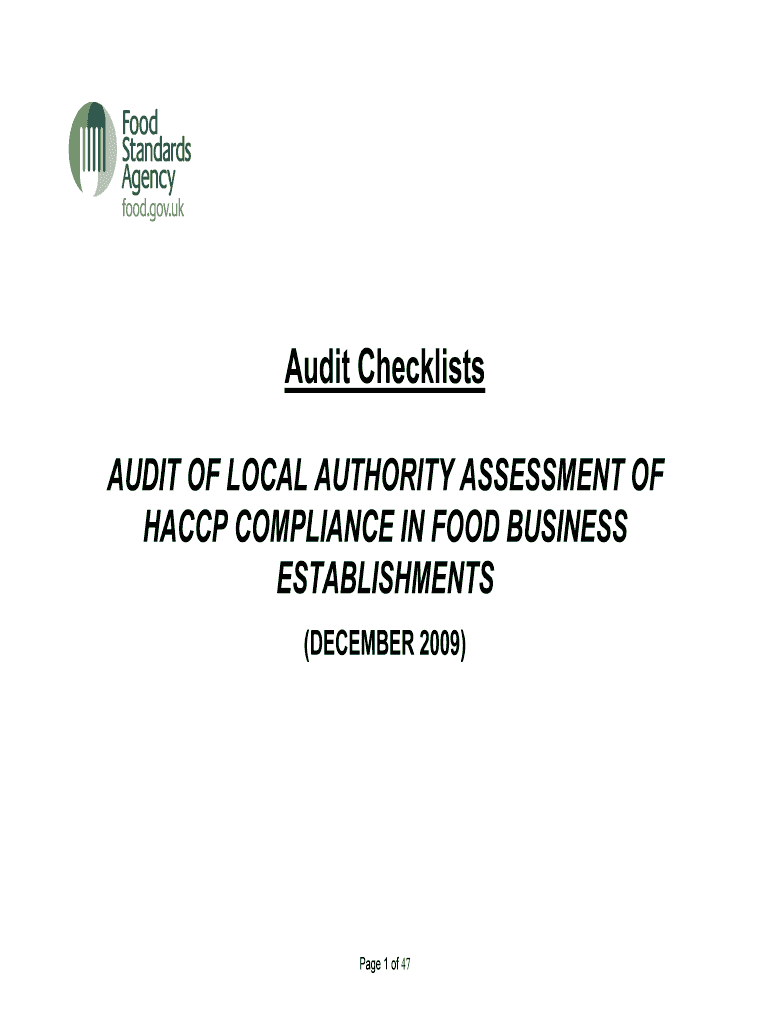 Audit Checklists AUDIT OF LOCAL AUTHORITY ASSESSMENT OF HACCP COMPLIANCE IN FOOD BUSINESS ESTABLISHMENTS (DECEMBER 2009)Page 1 of 47 insert names of LA HACCP AUDIT CHECKLISTS FSA HACCP December 2009Contents