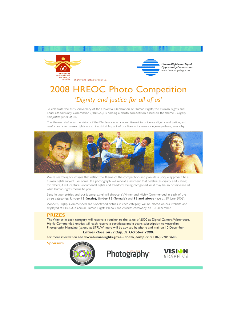 The purpose of the HREOC Photo Competition is to raise awareness about human rights issues through photography.