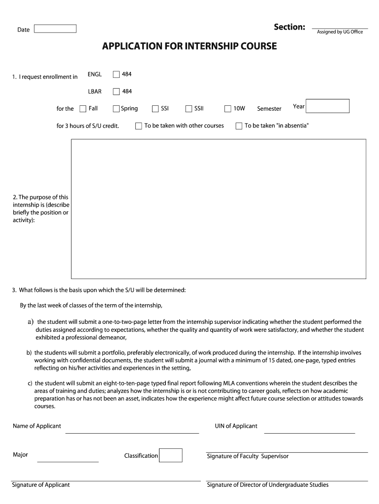 Section: Date Assigned by UG Office APPLICATION FOR INTERNSHIP COURSE for the EGL 484 BAR 1. I request enrollment in 484 Fall Spring for 3 hours of S/U credit. SSI SSII 10W To be taken with other