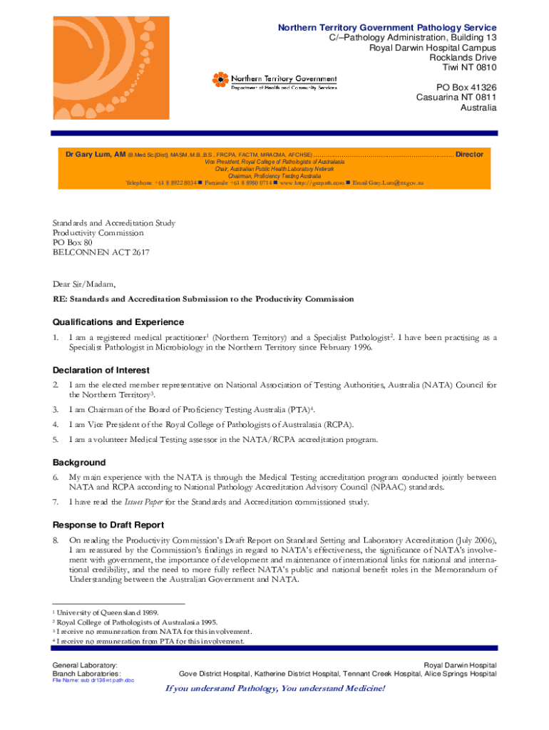 Northern Territory Government Pathology Service C/Pathology Administration, Building 13 Royal Darwin Hospital Campus Docklands Drive Kiwi NT 0810 PO Box 41326 Catarina NT 0811 Australia Dr Gary Sum,