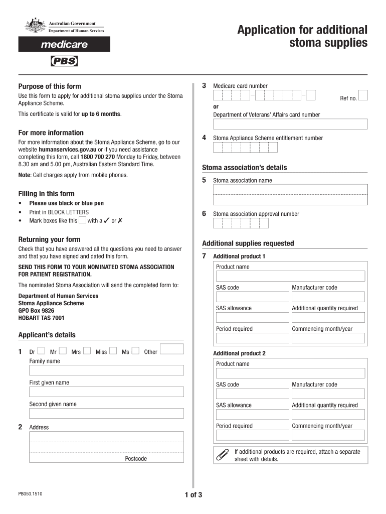 Application for additional stoma supplies 3 Medicare card number Purpose of this form Use this form to apply for additional stoma supplies under the Stoma Appliance Scheme. Or Department of Veterans