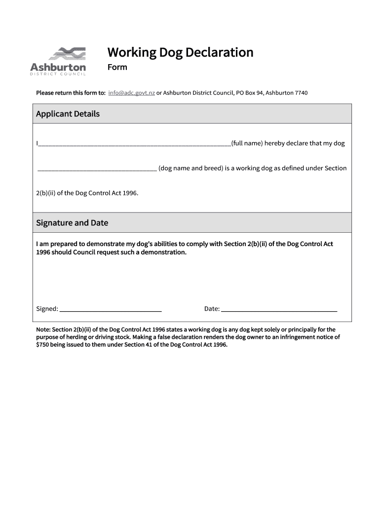 Working Dog Declaration Form Please return this form to: info ADC.govt.NZ or Ashburn District Council, PO Box 94, Ashburn 7740 Applicant Details I (full name) hereby declare that my dog (dog name