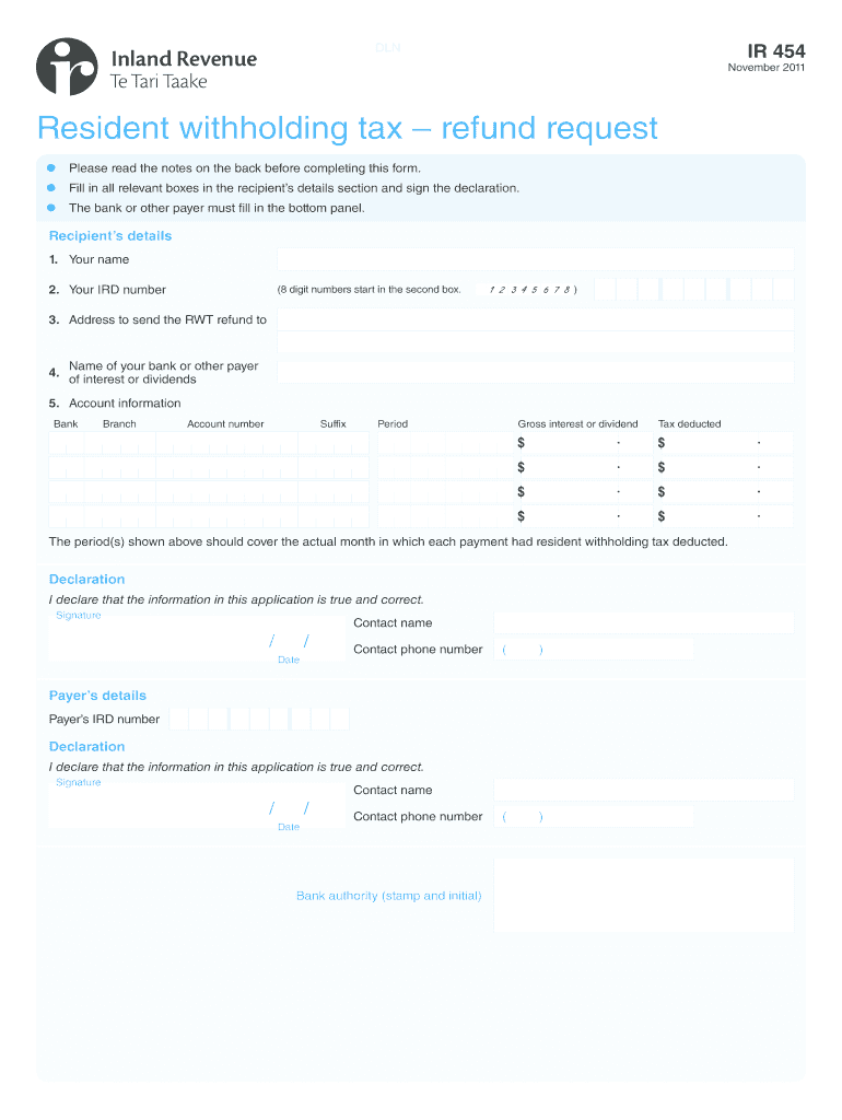 IR 454 DAN November 2011 Resident withholding tax refund request Please read the notes on the back before completing this form. Fill in all relevant boxes in the recipients details section and sign