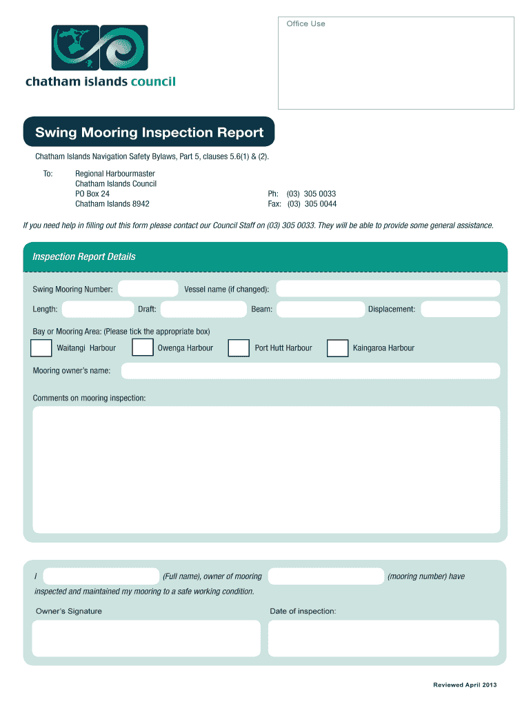 Office Use Swing Mooring Inspection Report Chatham Islands Navigation Safety Bylaws, Part 5, clauses 5.6(1) & (2). To: Regional Harbormaster Chatham Islands Council PO Box 24 Chatham Islands 8942